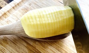 - Peel the potatoes. Carefully slice thin cuts into each potato, about 3 mm apart, without cutting all the way through. (Tip: Place a potato on a wooden spoon or chopsticks on either side of the potato to prevent cutting through.)